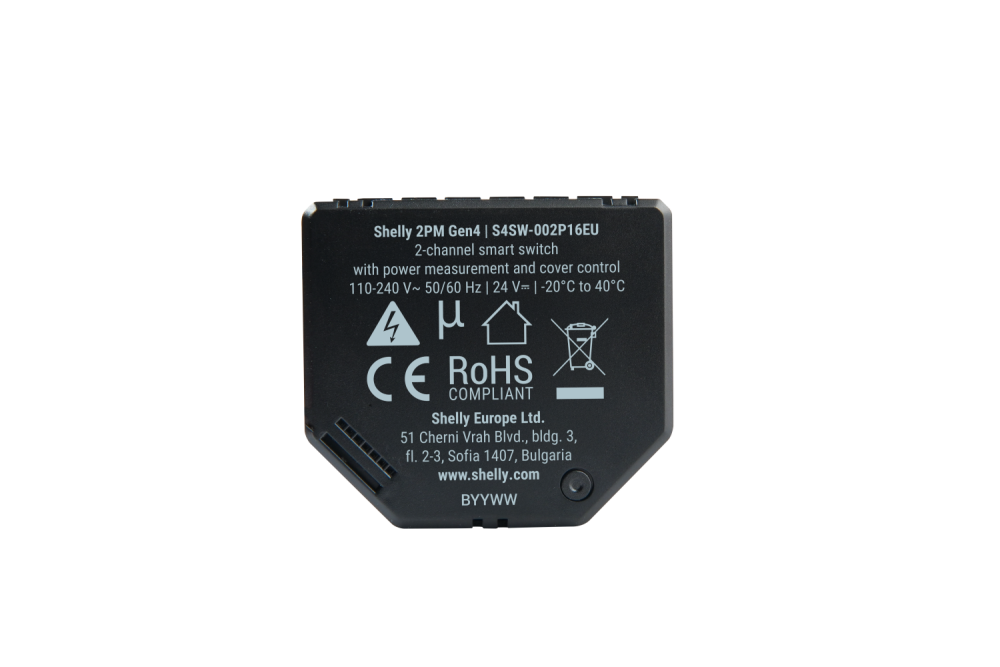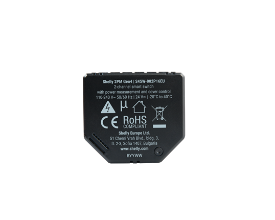 Shelly 2PM Gen4 är ett kraftfullt smart, inbyggt relä med 2 oberoende kanaler, designat för att styra belysning, jalusier, persienner, markiser och andra elektriska laster.
